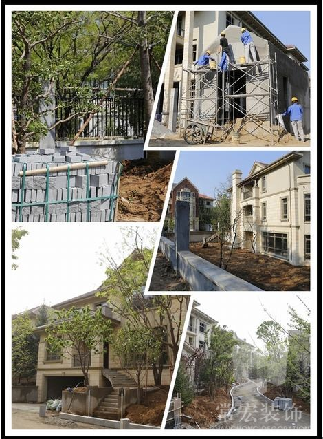 此項(xiàng)目常宏裝飾負(fù)責(zé)的鐵藝欄桿的安裝、地面的鋪裝、外墻及景觀的施工等。圖片中工人正在進(jìn)行別墅警衛(wèi)室的施工。