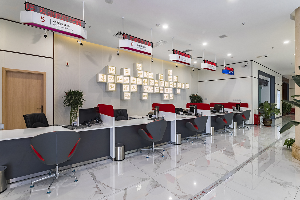 在設(shè)計(jì)上,和平支行以“和”為設(shè)計(jì)主題,將“和”字元素融入到營(yíng)業(yè)廳內(nèi)部空間,打造“網(wǎng)點(diǎn)+文化”的特色營(yíng)業(yè)廳。“和”字蘊(yùn)含了平等共事、和諧共處、多樣共存、合作共贏等普世價(jià)值觀。傳統(tǒng)文化與智能化的結(jié)合,使和平支行充滿(mǎn)了新的生命力,代表了和平支行的工作態(tài)度和對(duì)顧客的服務(wù)態(tài)度。