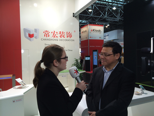 做為中國參展企業(yè)的代表,常宏裝飾總經(jīng)理王躍先生在展位接受了展會主辦方(杜塞爾多夫展覽公司)的采訪,就歐洲零售業(yè)、中國零售業(yè)和EuroShop等主題闡述了常宏裝飾的觀點(diǎn)和建議。