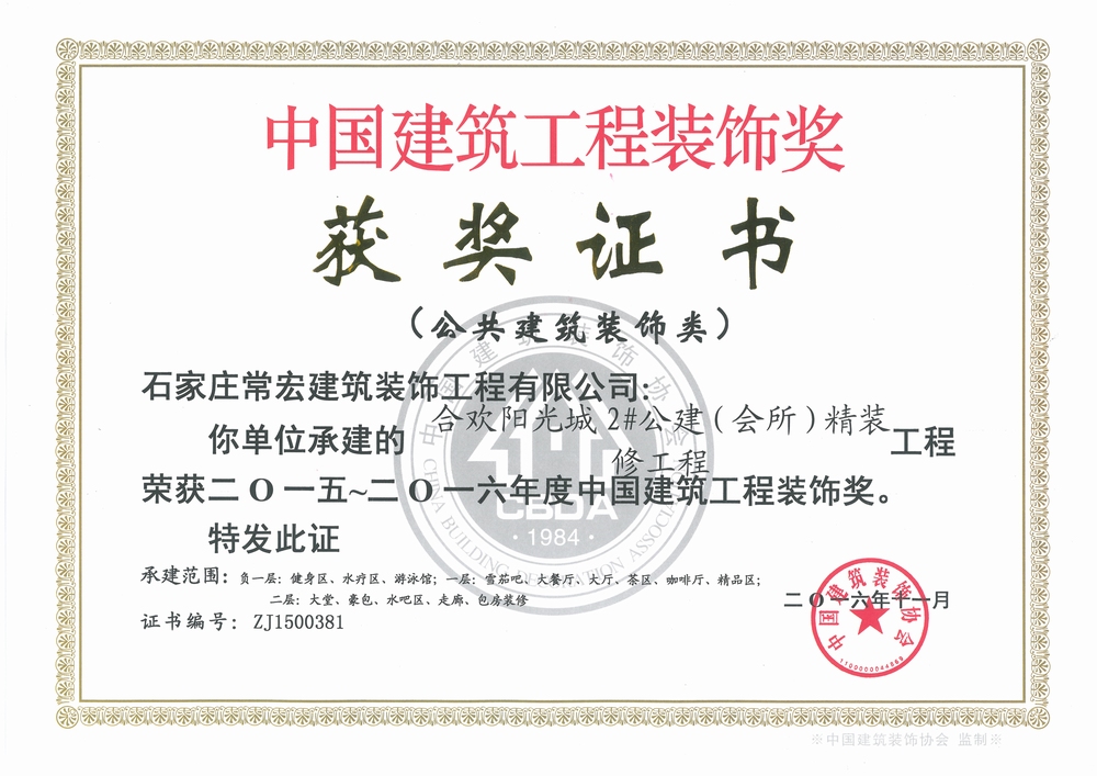 2016年12月23日,2015-2016年度中國建筑工程裝飾獎頒獎大會在北京國家會議中心召開。會上,由常宏建筑裝飾工程有限公司承建的合歡陽光城2#公建(會所)精裝修工程、金地大廈B座內(nèi)裝修工程一標(biāo)段兩項工程,榮獲2015-2016年度中國建筑工程裝飾獎——公共建筑裝飾類。常宏店裝大區(qū)管理中心總經(jīng)理周增良、品管部安全副總監(jiān)孫文海參加了此次頒獎大會。