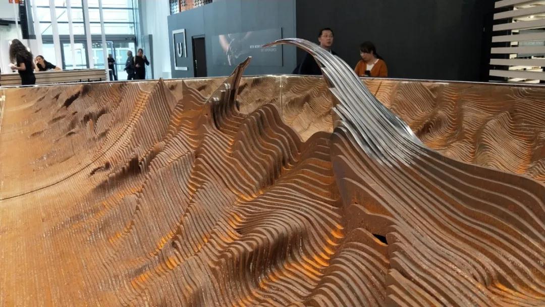 迎面而來(lái)的是接待區(qū),在此設(shè)計(jì)公司給大家呈現(xiàn)了一組鋼制的雕塑。這個(gè)雕塑像山脈、似浮云,鋼鐵的堅(jiān)硬與柔軟的外觀形成鮮明的對(duì)比。整個(gè)雕塑沉浸在一個(gè)箱體中,露出來(lái)的部分代表是設(shè)計(jì)的結(jié)果,是最靚麗動(dòng)人的部分。而雕塑大部分則是沉浸在箱體中,復(fù)雜而多變,代表著設(shè)計(jì)背后復(fù)雜而大量的工作。頓時(shí)“感同身受”。