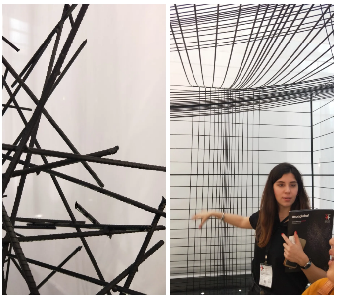 背景墻右邊是展區(qū)的入口,在此設(shè)計(jì)師用復(fù)雜而沒(méi)有規(guī)則的“鳥(niǎo)巢式”鋼筋做成了穹頂空間,代表著每一次設(shè)計(jì)都是從紛繁復(fù)雜的、千頭萬(wàn)緒的情境中開(kāi)始的,隨后鋼筋變成了有節(jié)奏和韻律的五線譜,即是設(shè)計(jì)終于理清的思路,向著光明進(jìn)發(fā)。
