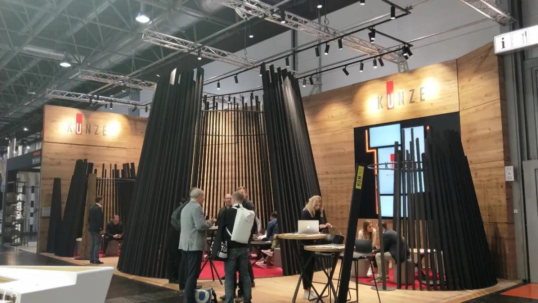 KUNZE這家公司的展區(qū)用線條組成了三個(gè)大小不同的圓錐體,圍合而成為洽談區(qū),很有設(shè)計(jì)公司的“范兒”。