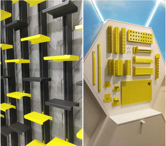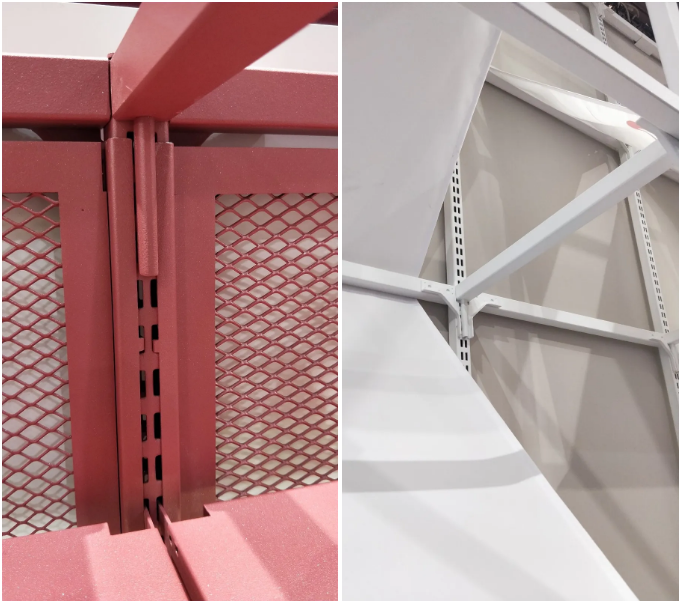 1、道具采用標(biāo)準(zhǔn)化設(shè)計(jì)、模塊化組合,具備拆裝組合的能力,無論什么尺度的道具一定是分體組合的。而且鋼立柱的種類繁多,結(jié)合各類支架、層板和不同的顏色噴涂組合而成形式多樣的道具。