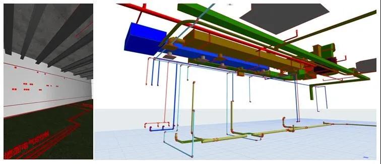 廚區(qū)隔斷是電氣設備集中,各類專業(yè)管線(強弱電、給水)、交叉最多的部位。利用BIM技術(shù)對各類管線進行有序的布置,所有的電氣管線、面板都在工廠預制完成,隔斷頂部預留接線盒。隔斷分片運輸,現(xiàn)場組裝成整體,頂部線盒完成接線。