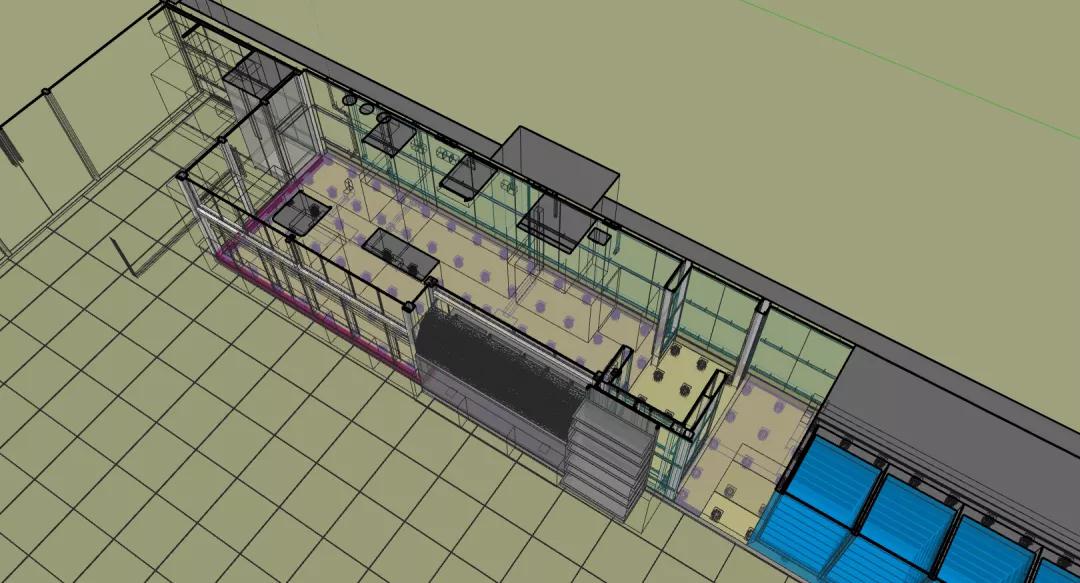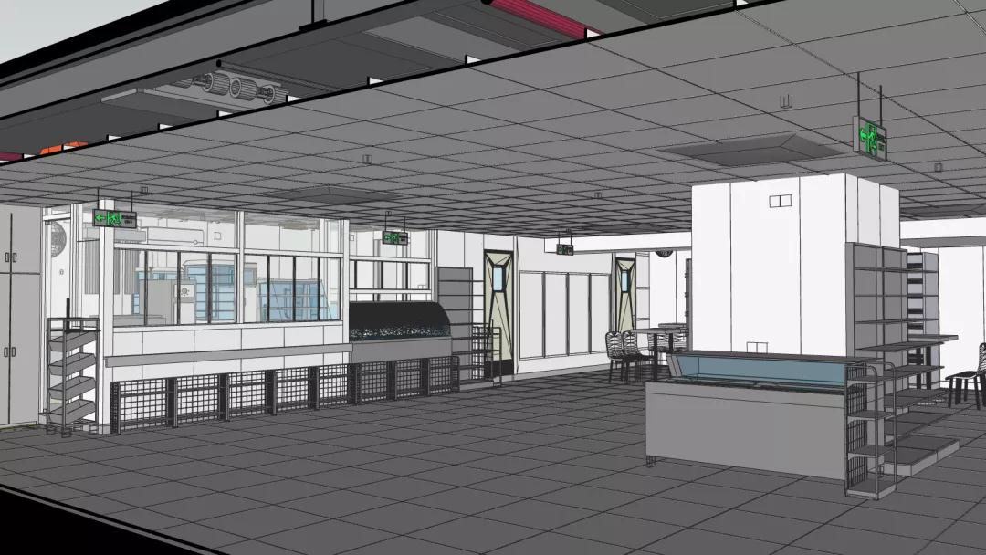 店鋪分為客區(qū)和廚區(qū)兩大區(qū)域,涉及到裝修、強弱電、給排水、通風、空調(diào)、消防等多種專業(yè),涉及到甲方的家具和設備廠家10余家。設備數(shù)量共計30余種,僅強電面板插座就有150余個。專業(yè)交叉多,管線復雜,現(xiàn)場條件苛刻,疫情期間的各種管控帶來的人員管理和材料采購困難都是此次項目實施的難點。而“BIM+裝配式”就在此刻助力店鋪快速落地,精準實施。