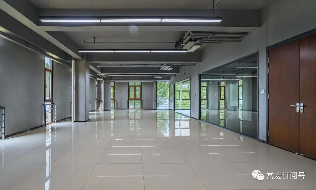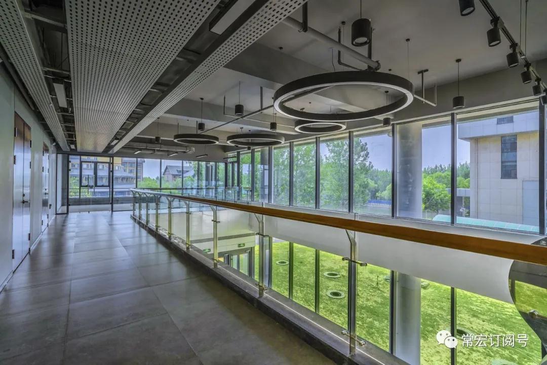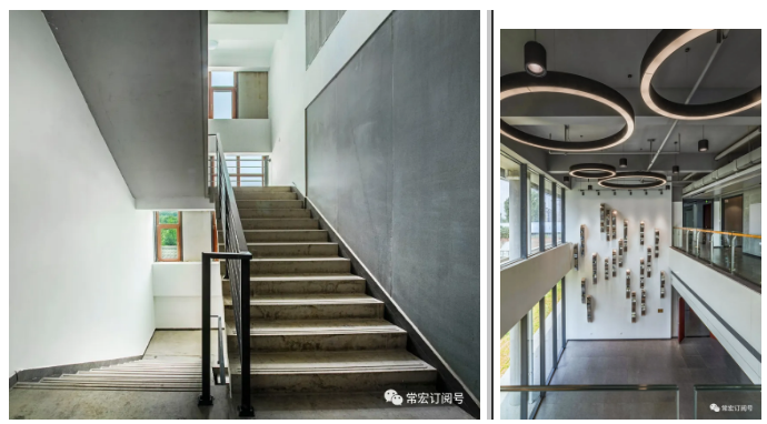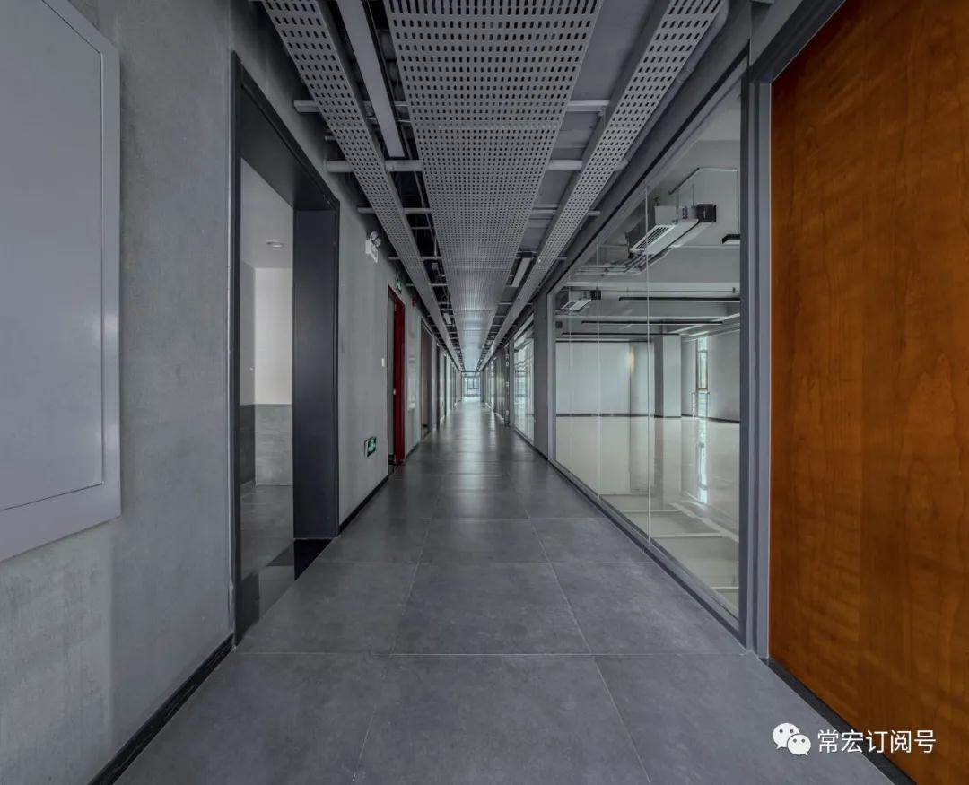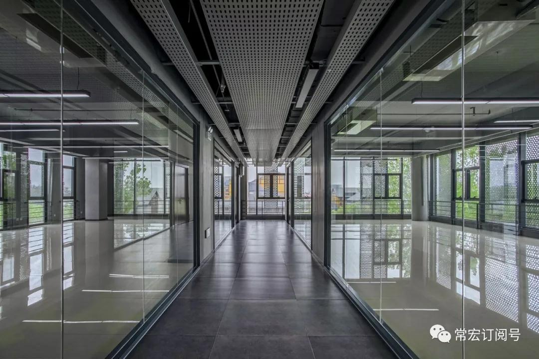 本項目室內設計風格延續(xù)了外觀設計的工業(yè)建筑特點,把清水面的樸素質感延伸到室內。如室內走廊吊頂各種管線的外露,加以穿孔鋁板半遮半掩的裝飾,既強調了工業(yè)特點,又是對建筑外觀裝飾語言的延續(xù)和呼應。整個室內的空間設計與建筑融為一體。
