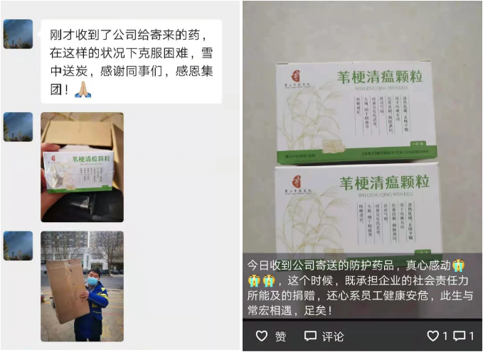2021年,新冠疫情再度爆發(fā),香港旭日集團(tuán)及常宏本部心系員工健康,選了經(jīng)過(guò)2020年初抗疫前線應(yīng)用的有效藥品「葦梗清瘟顆?!梗ā?jìng)浒肝奶?hào)」贛藥制備:Z20200002000)發(fā)放給全體員工。1月初,常宏將首批顆粒發(fā)放給一線工人,后受疫情影響,在石家莊市快遞恢復(fù)的第一時(shí)間,14日起陸續(xù)將藥品以郵寄的形式發(fā)放給全體員工,用于大家預(yù)防新冠肺炎,以實(shí)際行動(dòng)關(guān)心關(guān)愛(ài)員工,讓大家安全感滿滿。