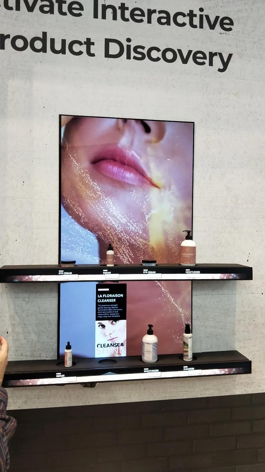 在它的旁邊是一款智能貨架,兩個(gè)層板上的產(chǎn)品均可以顯示價(jià)格,同時(shí)當(dāng)產(chǎn)品位置發(fā)生變換的時(shí)候,價(jià)格也跟著調(diào)整。背面是一整塊大屏幕,閑時(shí)播放產(chǎn)品廣告遠(yuǎn)距離傳播,當(dāng)有產(chǎn)品被拿取的時(shí)候大屏幕會(huì)以畫中畫的形式展示所拿取商品的信息。